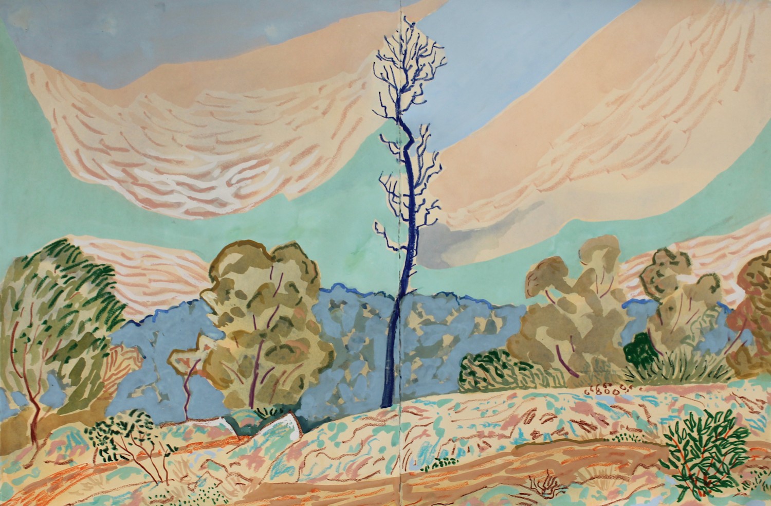 Watercolour, gouache and oil pastel on paper