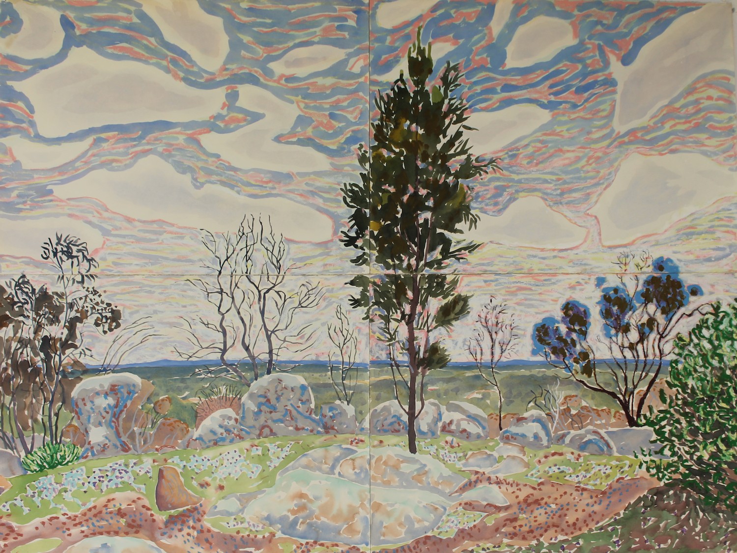 Watercolour, gouache, and oil pastel on paper.